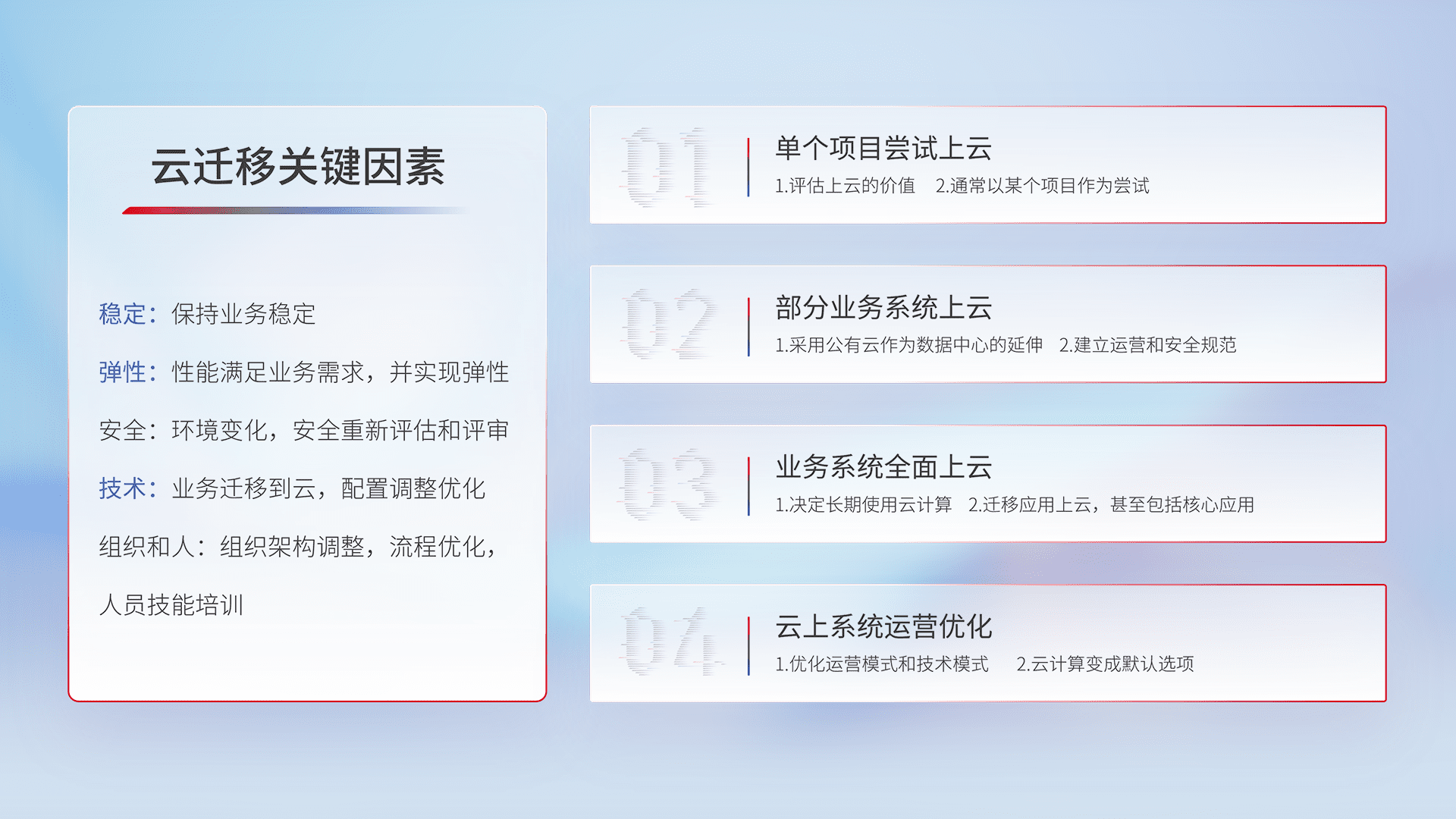 结合实际业务,,,从规划设计、、、、云平台选型、、云原生改造、、、、数据迁移、、、、集成交付,,,迁移全过程为客户识别最佳上云路径,,,,做好风险识别管理,,,,设计网络架构、、身份权限、、、、安全审计合规、、、、操作审计、、日志审计、、、监控告警策略、、、多站点容灾设计等,,,,对云上基础设施进行整体规划,,,提升IT治理水平,,,,以满足弹性、、高可用、、高性能的需求。。。